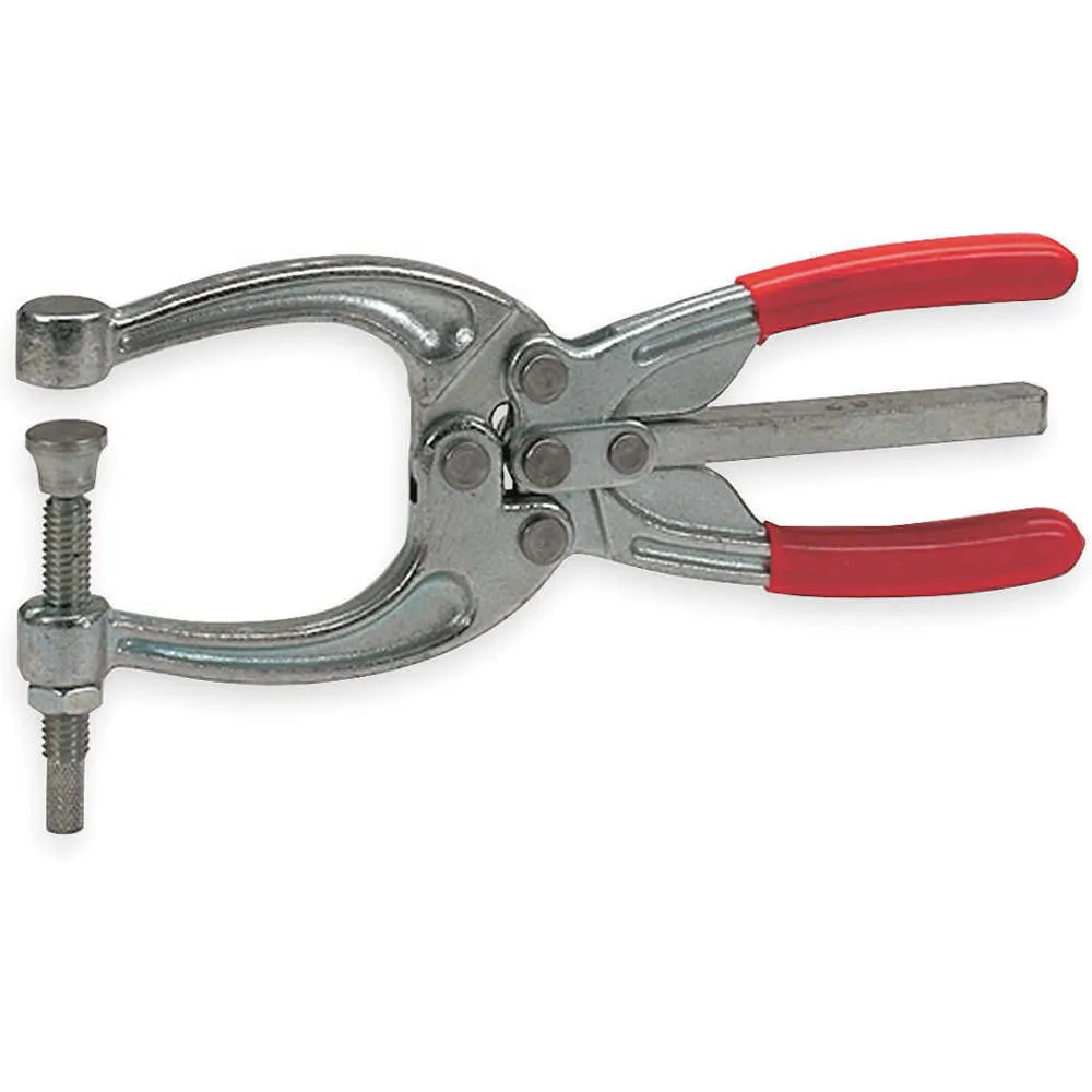 Destaco 482 squeeze action clamp, also known as manual toggle clamp or squeeze action plier clamp, is used to firmly grasp or attach objects. It is designed for quick & flexible clamping, molding, assembling, welding, bending and compressing applications in the aerospace, automotive and food & packaging industries. The clamp is well suited for providing quick & flexible clamping in high workload environments. This clamp features jaws that are automatically locked while closing and one or both the handles are squeezed against the central position to hold workpieces tightly. The plier clamp is supplied with 1 or 2 adjustable spindles to secure materials to work surfaces and offer convenience of easy one hand opening with trigger release function. Destaco squeeze action clamp features drop forged alloy steel construction for increased strength and is machined to close tolerances for a maximum holding capacity of 1200 lb. This clamp comes with a vinyl grip to fit the contour of underlying hand design. The clamp can accommodate hex head spindle accessory for high performance workholding, automation and containment solutions.